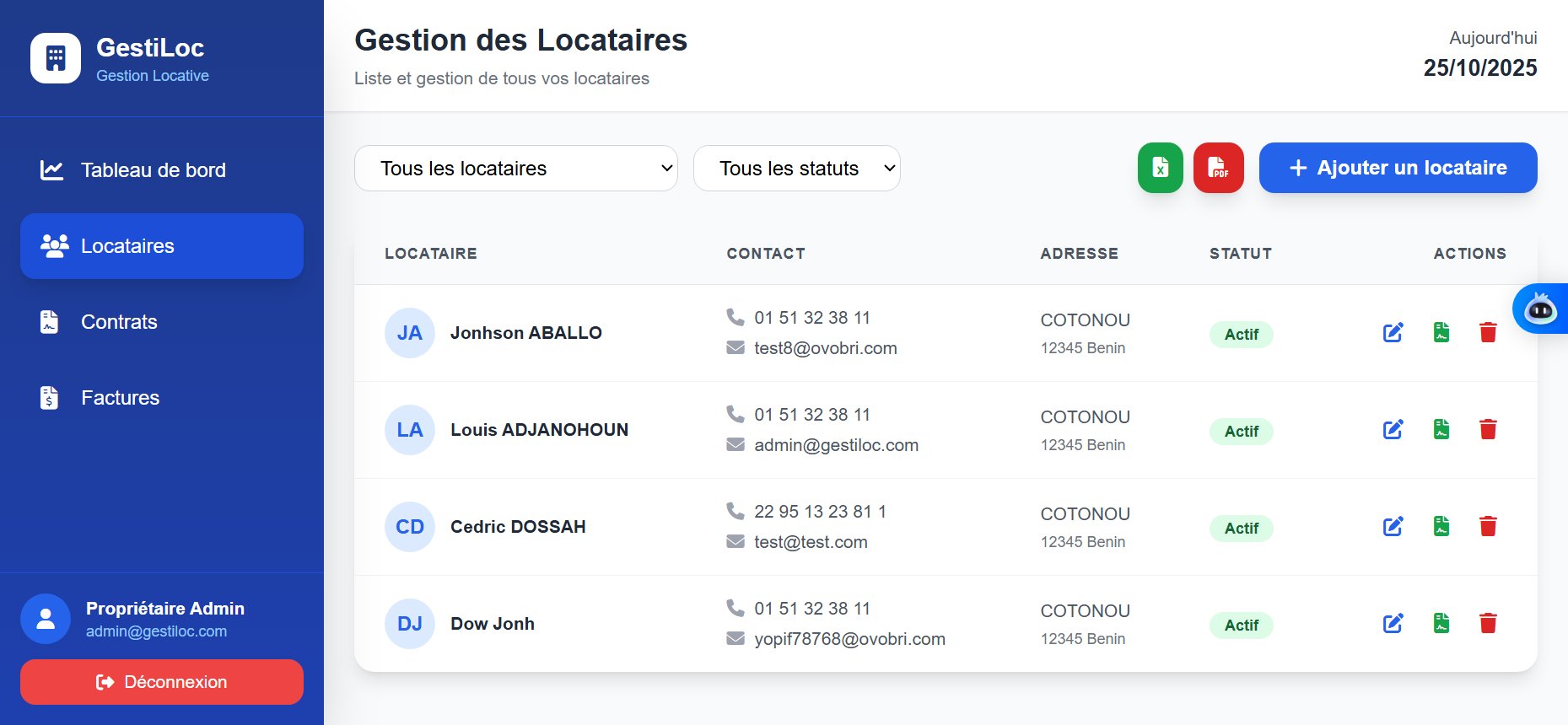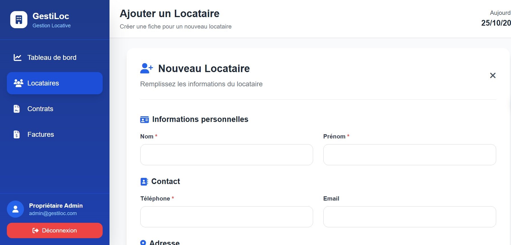 Créez et modifiez facilement les profils locataires avec toutes leurs informations de contact et d'adresse.