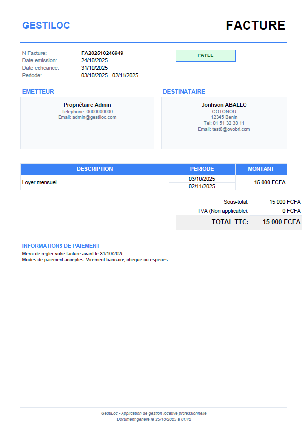 Créez des factures de loyer avec références uniques et dates d'échéance, avec suivi des statuts de paiement.