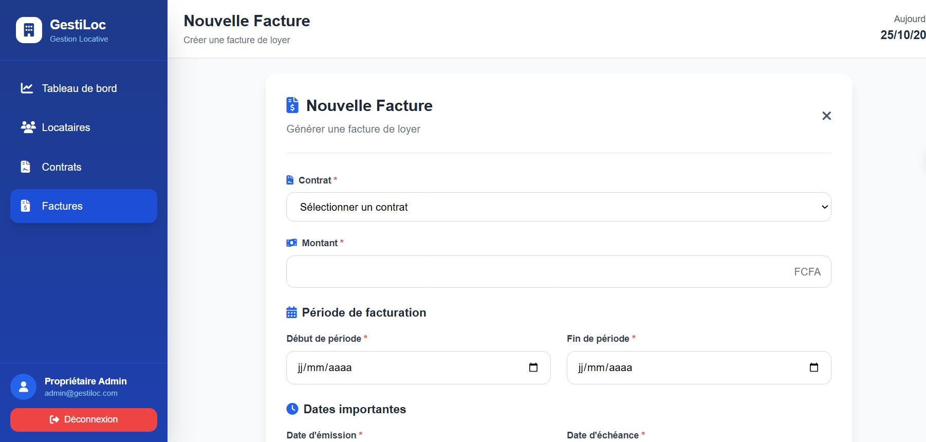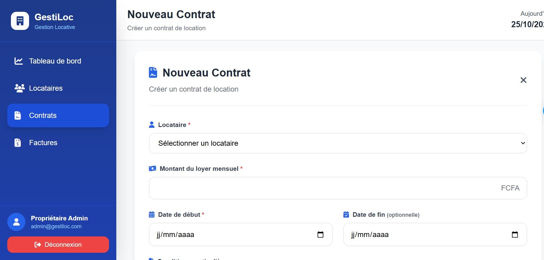 GestiLoc est une application web innovante conçue pour simplifier et optimiser la gestion locative pour les propriétaires et gestionnaires immobiliers. Notre plateforme centralise toutes les opérations : gestion des locataires, création et suivi des contrats, émission des factures, et analyse des performances. Que vous gériez un seul bien ou un parc immobilier important, GestiLoc vous offre des outils puissants pour automatiser vos processus, réduire les erreurs et gagner un temps précieux dans votre gestion quotidienne.