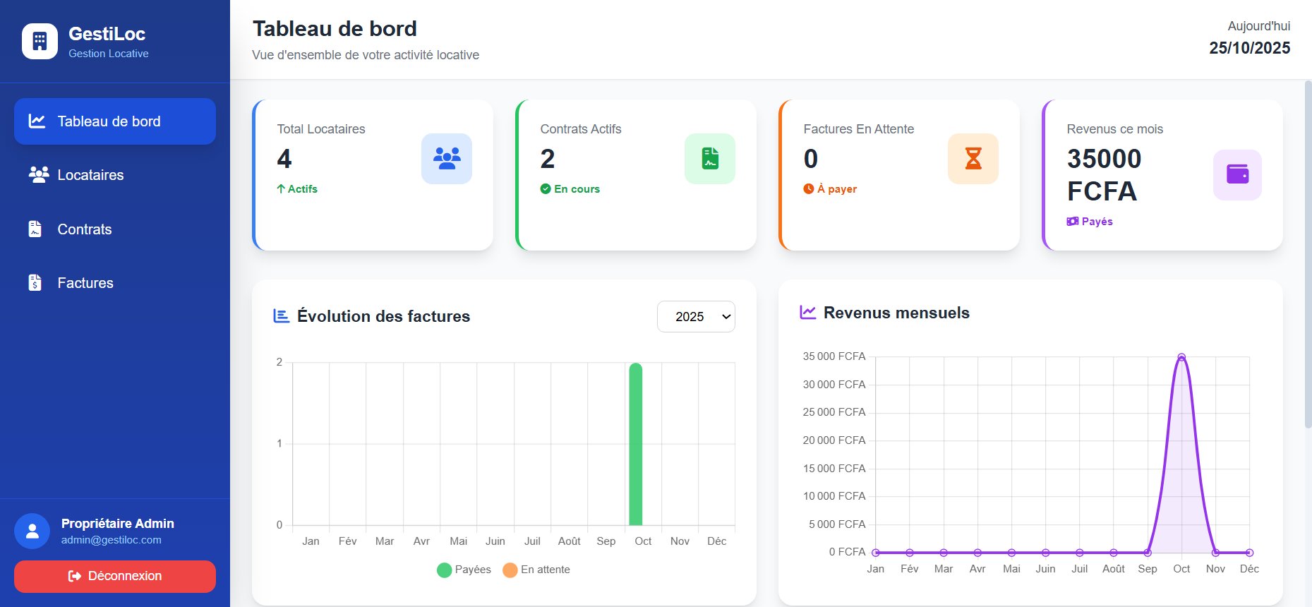 Surveillez vos indicateurs clés : revenus, contrats actifs, factures en attente et évolution mensuelle.