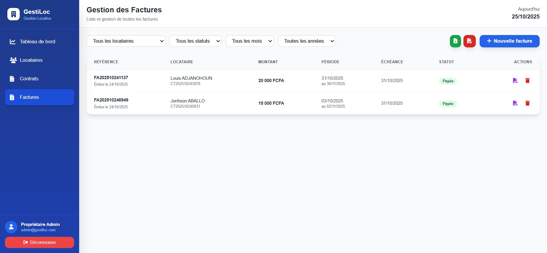 Créez des factures de loyer avec références uniques et dates d'échéance, avec suivi des statuts de paiement.